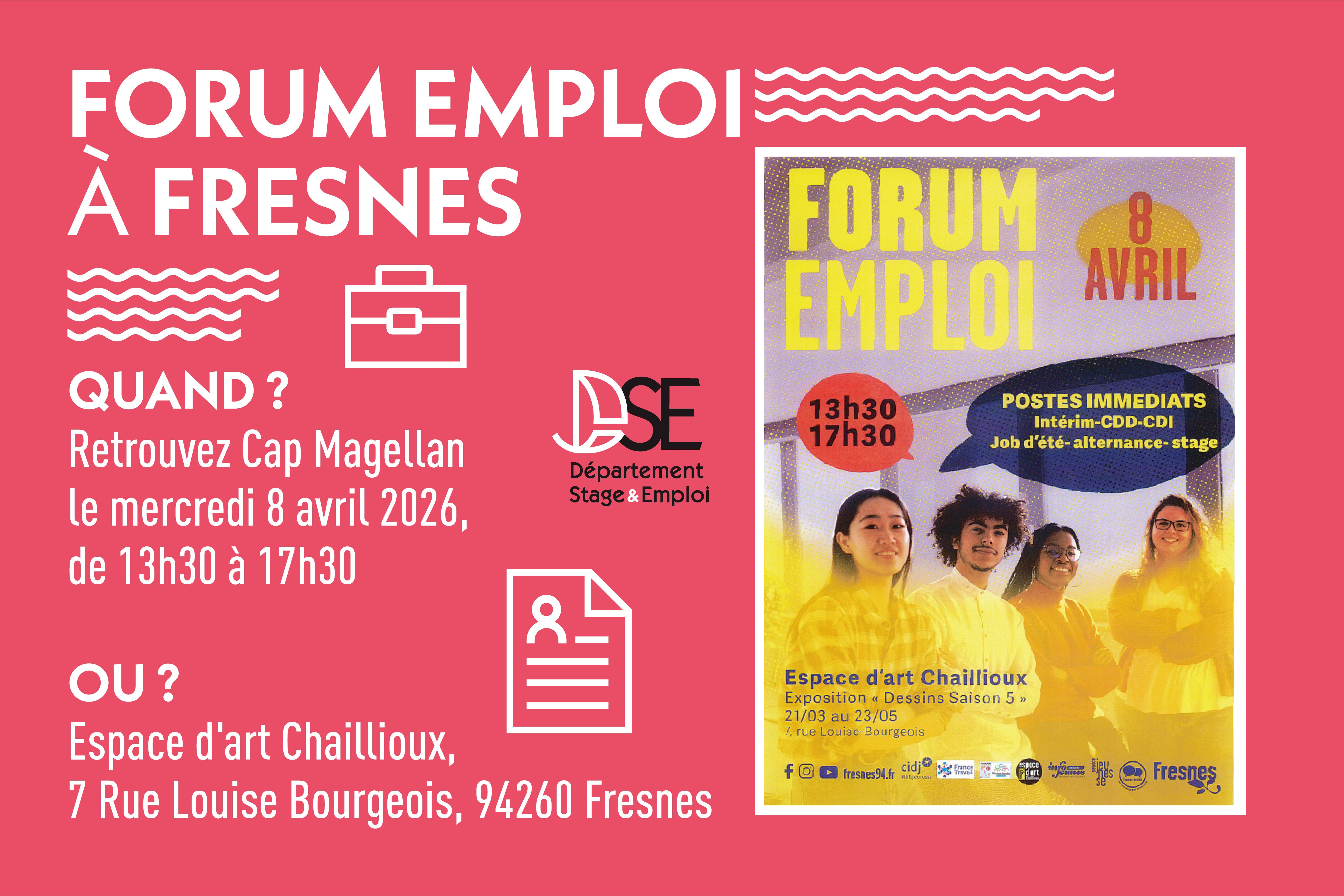 Retrouvez Cap Magellan le mercredi 8 avril 2026, de 13h30 à 17h30 à l'Espace d'art Chaillioux, 7 Rue Louise Bourgeois, 94260 Fresnes https://www.fresnes94.fr/actualites/forum-de-lemploi/ Le mercredi […]