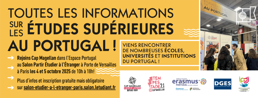 Cap Magellan réitère sa participation au Salon Partir Étudier à l’Étranger, qui se tiendra les 4 et 5 octobre 2025 à Paris, au Parc des Expositions de la Porte de Versailles, Pavillon 7.1. Cet événement incontournable vous permettra de découvrir l’excellence de l’enseignement supérieur portugais et d’explorer de nouvelles perspectives pour vos études. Que vous soyez lycéen à la recherche d’une orientation pour vos futures études, étudiant désireux de se réorienter ou d’acquérir une expérience internationale, ou encore parent ou enseignant cherchant à guider les jeunes dans leurs choix académiques, le Salon est l’occasion idéale pour vous.